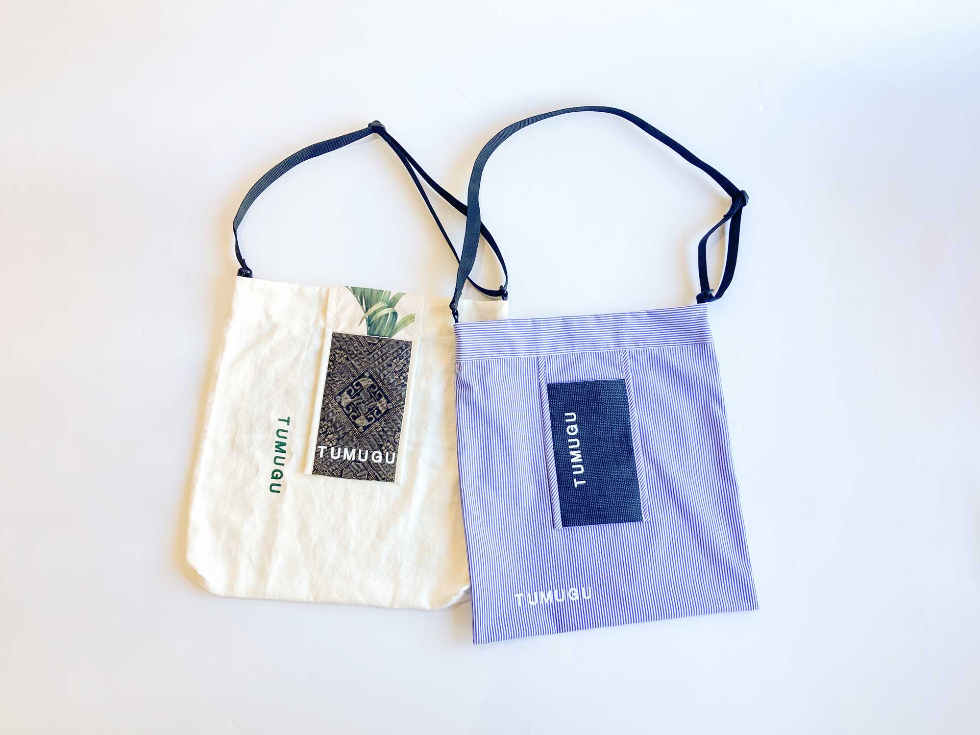 また短冊の部分は帆布生地を大和村にある染色工房でテーチ木の泥染めと藍染で絞り染めしたものをとり入れている。