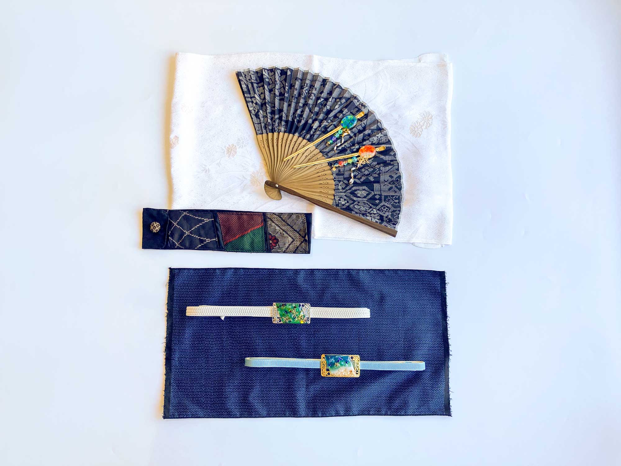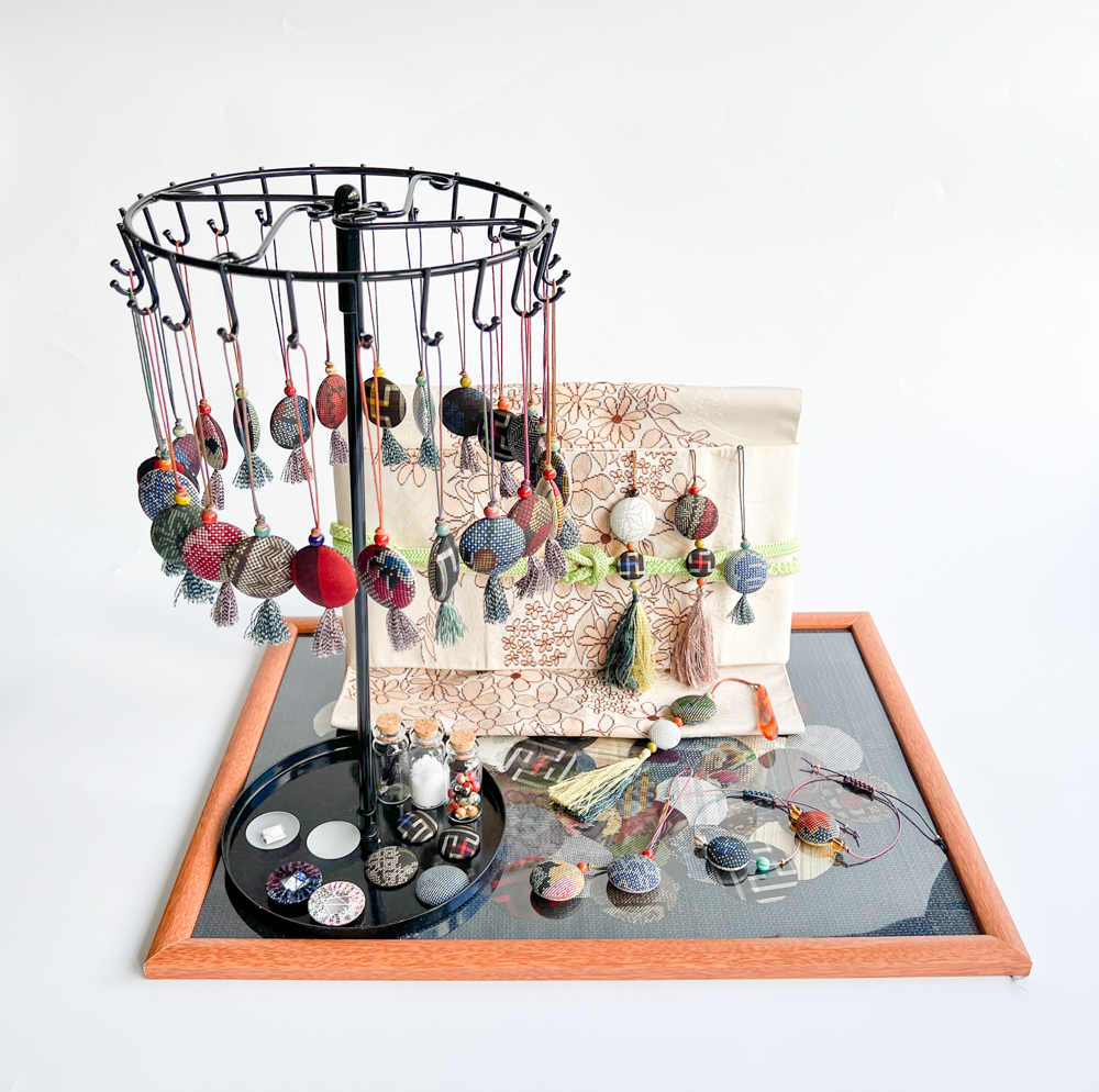 ・大島紬を使った細かいチャーム、とても魅力いっぱいで惹かれました。帯飾りだけでなく、髪飾りや他にもレイアウトできそうだなあと感じました。